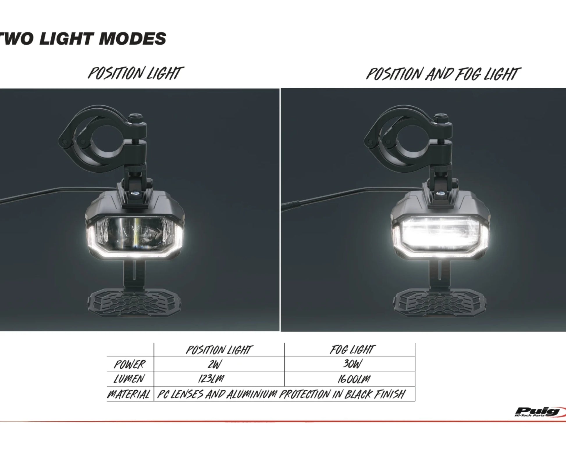 Lygterne er konstrueret i robust aluminium med beskyttende linsegitter, der skærmer mod sten og påvirkninger fra vejen. Sættet leveres komplet med ledningsnet, sikring og vandtæt styrekontakt, hvilket sikrer enkel installation og betjening. Effektiv varmeafledning understøtter stabil drift, selv ved længere tids brug.